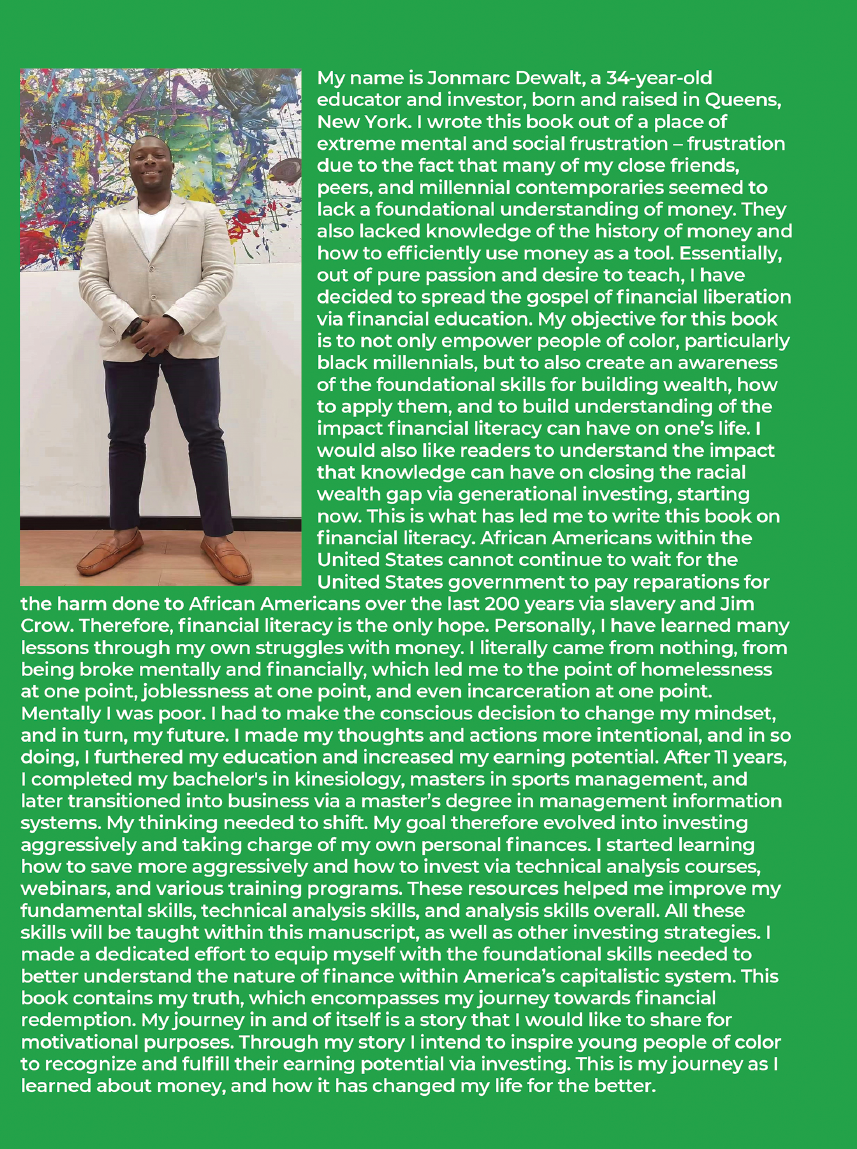 Growing up in Queens NY, Jonmarc was frustrated by the lack of financial knowledge among his close friends, peers, and millennial contemporaries. This frustration led him to write this powerful book on the topic of financial literacy and investing, with the hope of spreading the gospel of financial liberation through education.